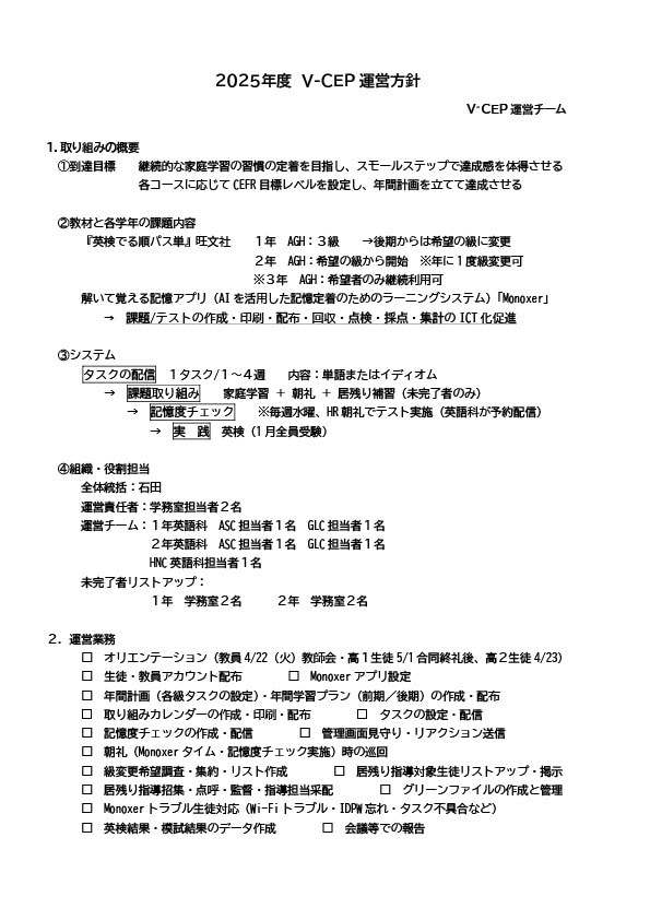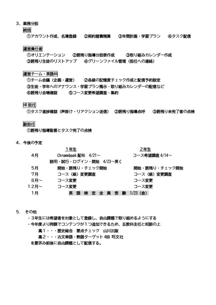 取り組み | ・Book 年間予定等のシステムは管理者で一括管理、配信をし、授業での呼びかけ、小テスト(チェック)は英語科、週の取り組みの居残りサポートは学務室、担任団で実施。 校内で役割分担を行い、連携して進めている。 |