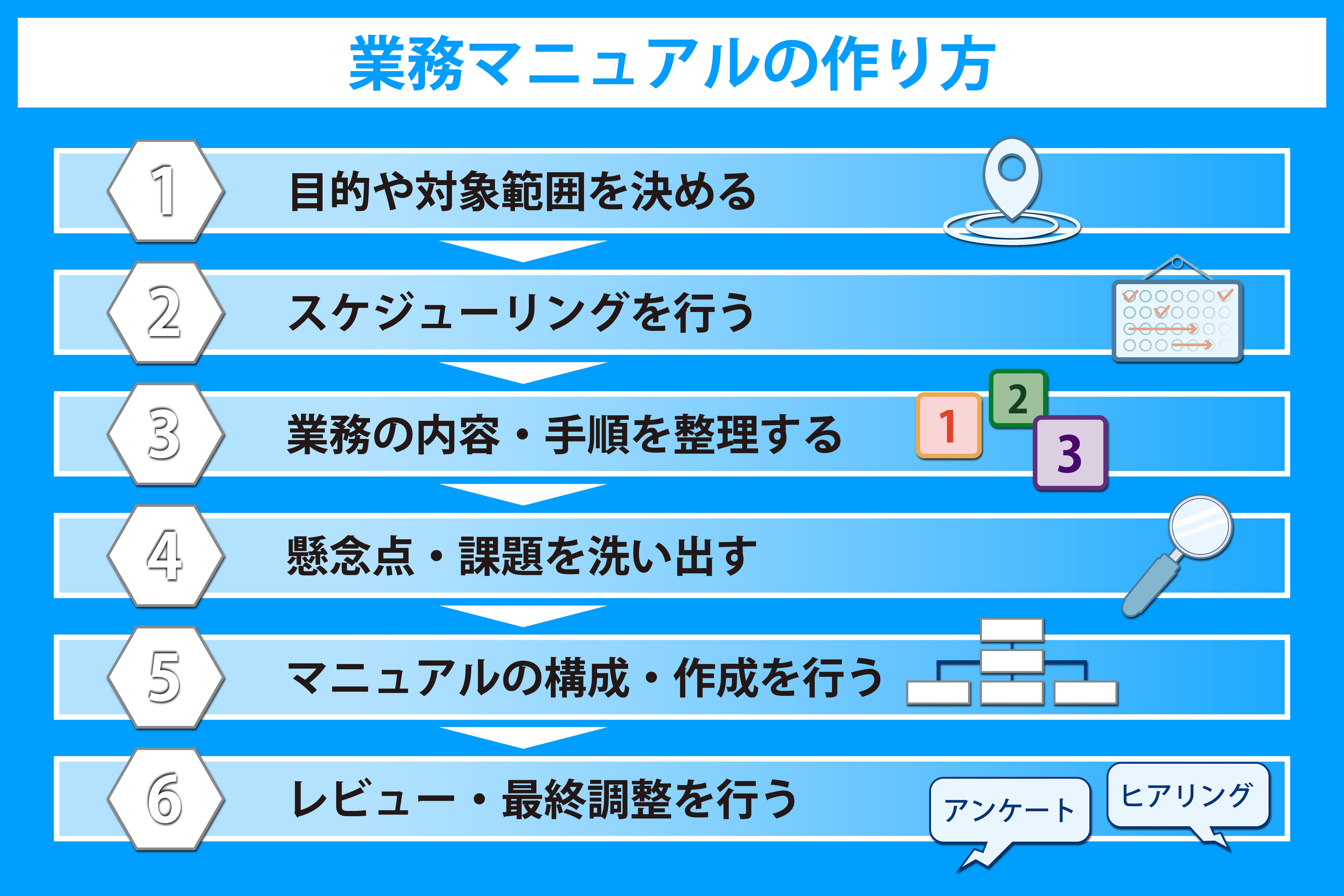 有用性の高い業務マニュアルを作るには、作り方の手順が重要です。ここでは、形骸化しづらい業務マニュアルを作る流れについて、6つのステップで紹介します。