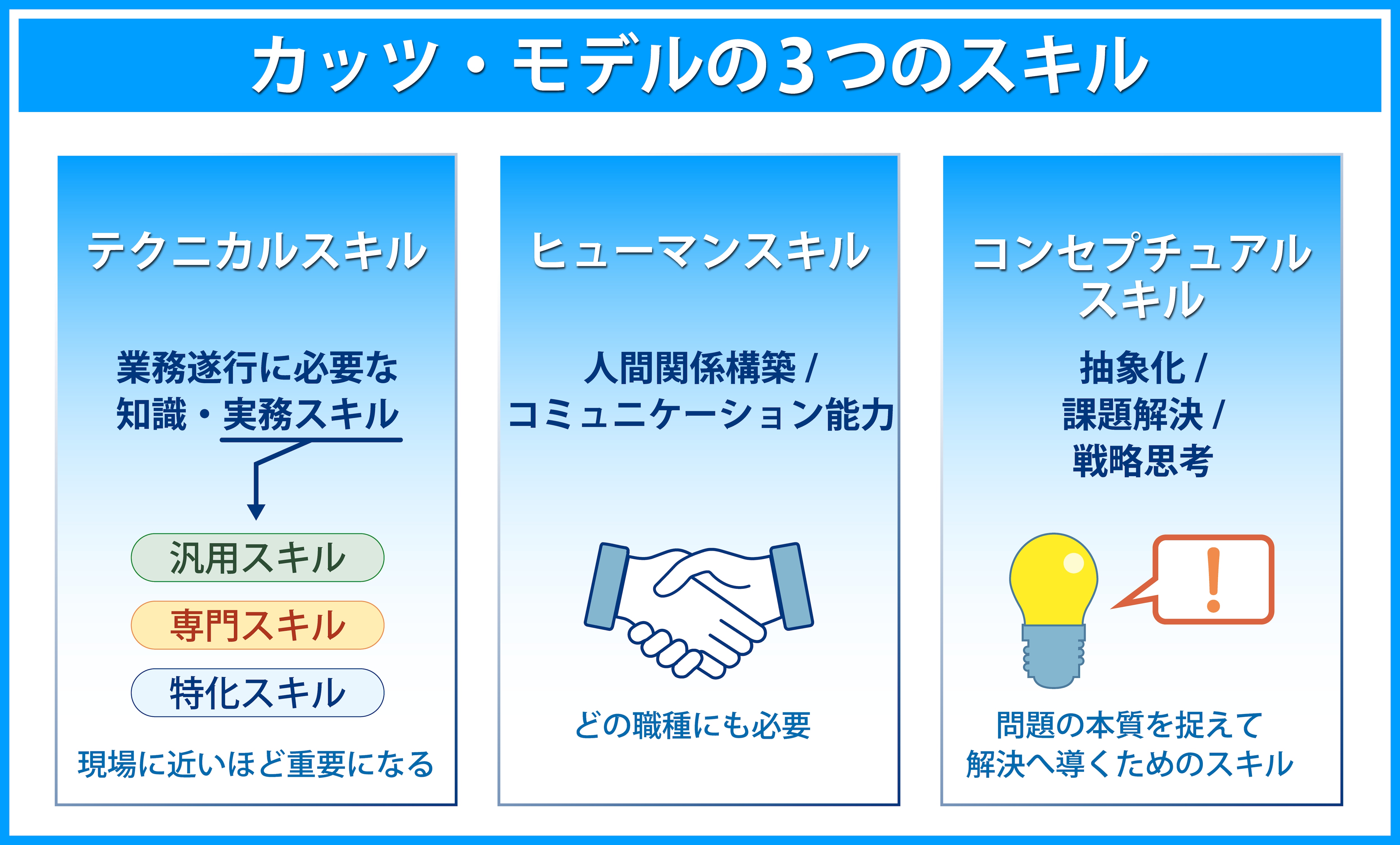 ここでは、スキル管理で押さえておくべき「業務上必要な3つのスキル」を、アメリカの経営学者ロバート・L・カッツ氏が提唱した「カッツ・モデル」を基に解説します。