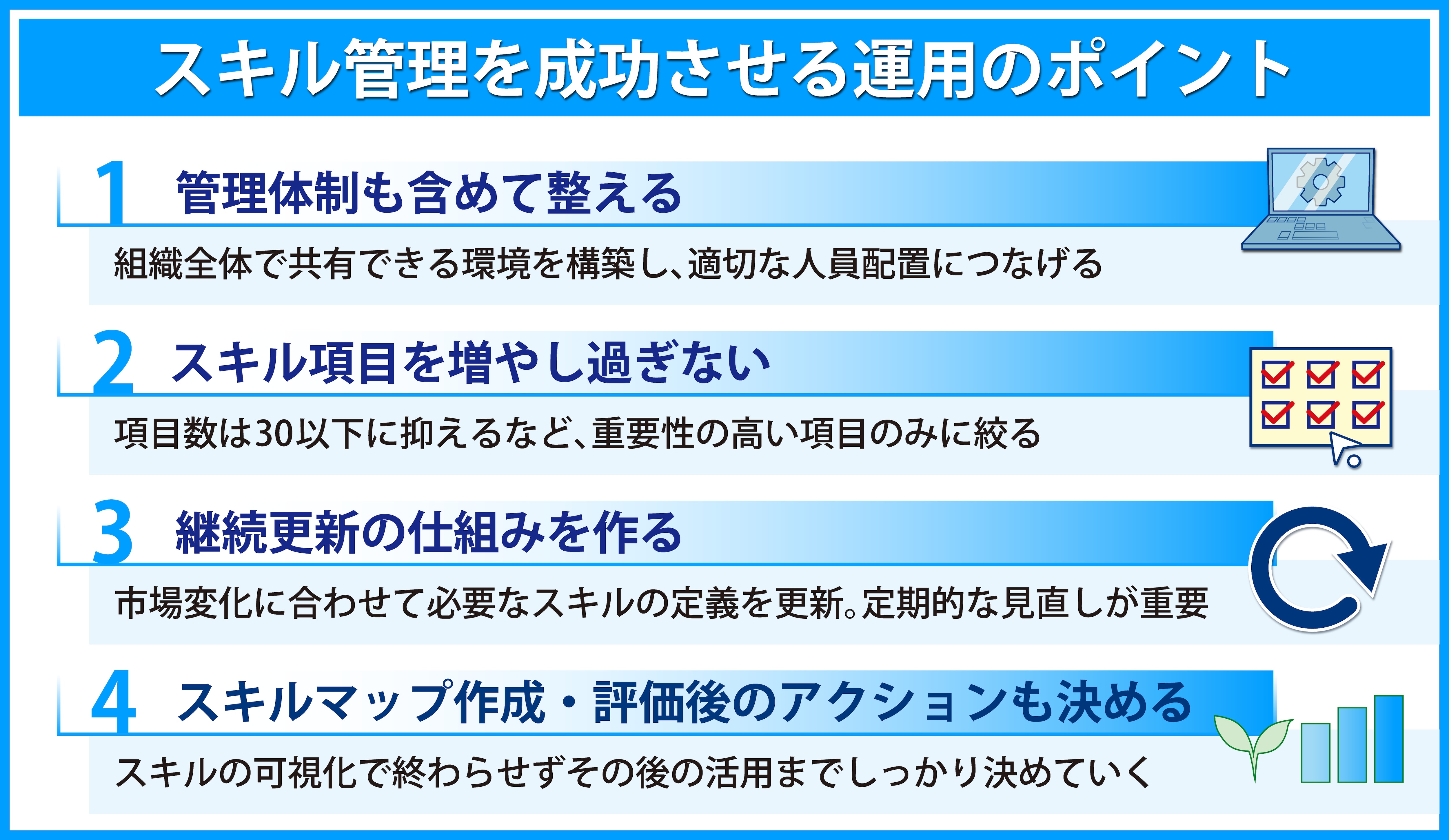 ここでは、スキル管理を成功させるために押さえておきたい運用上のポイントを4つお伝えします。