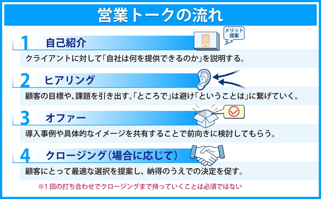 営業トークは「自己紹介」「ヒアリング」「オファー」「クロージング」の4ステップで進めていくのが基本です。基本の流れやよくある会話パターンを覚えて、自然に使えるまで練習しましょう。