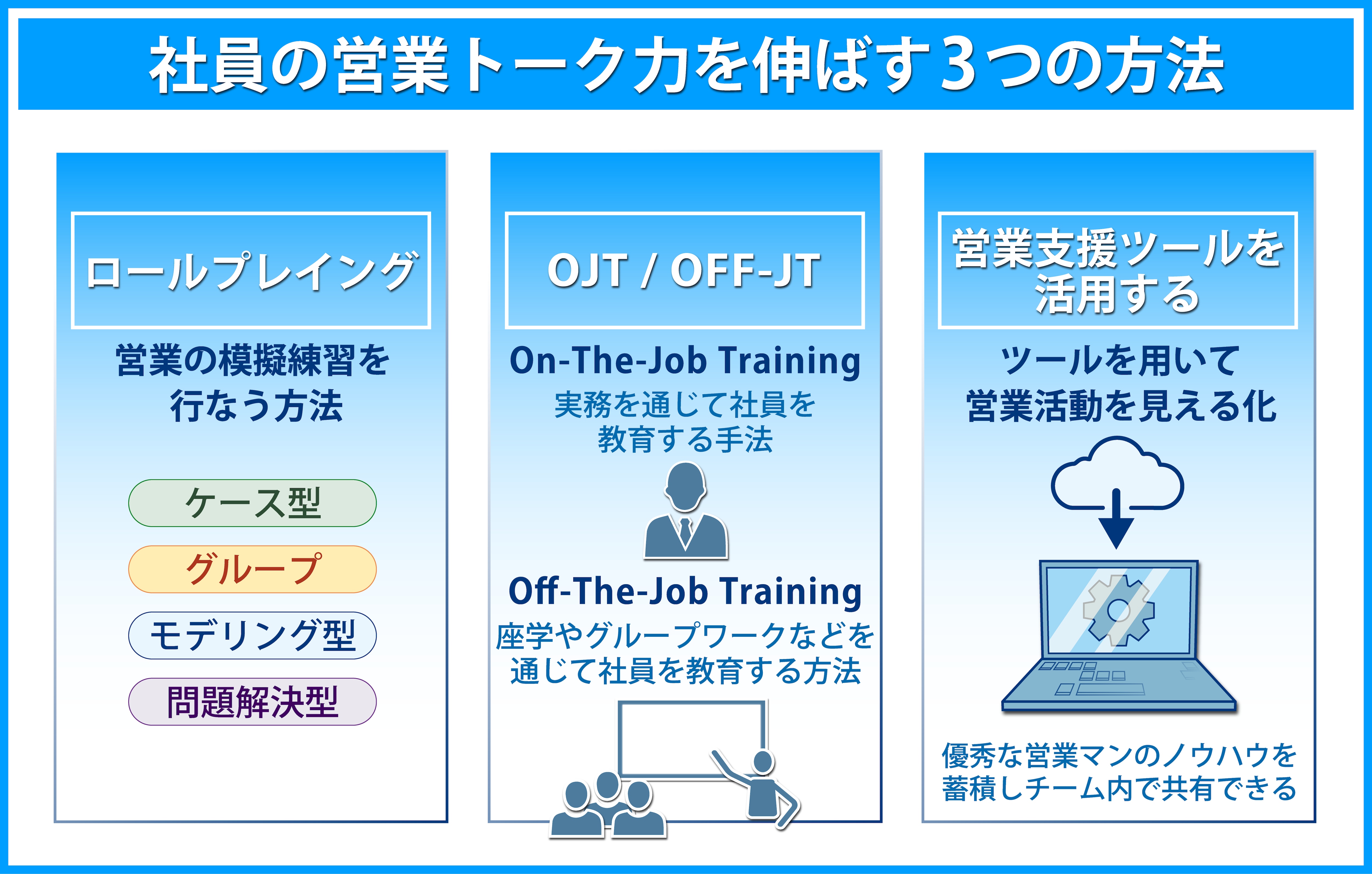 トーク力を身に付ける方法には、ロールプレイングやOJTを行ったり、営業支援ツールを活用したりする方法があります。自社の営業担当者の現状をふまえて、最適な手法を導入しましょう。