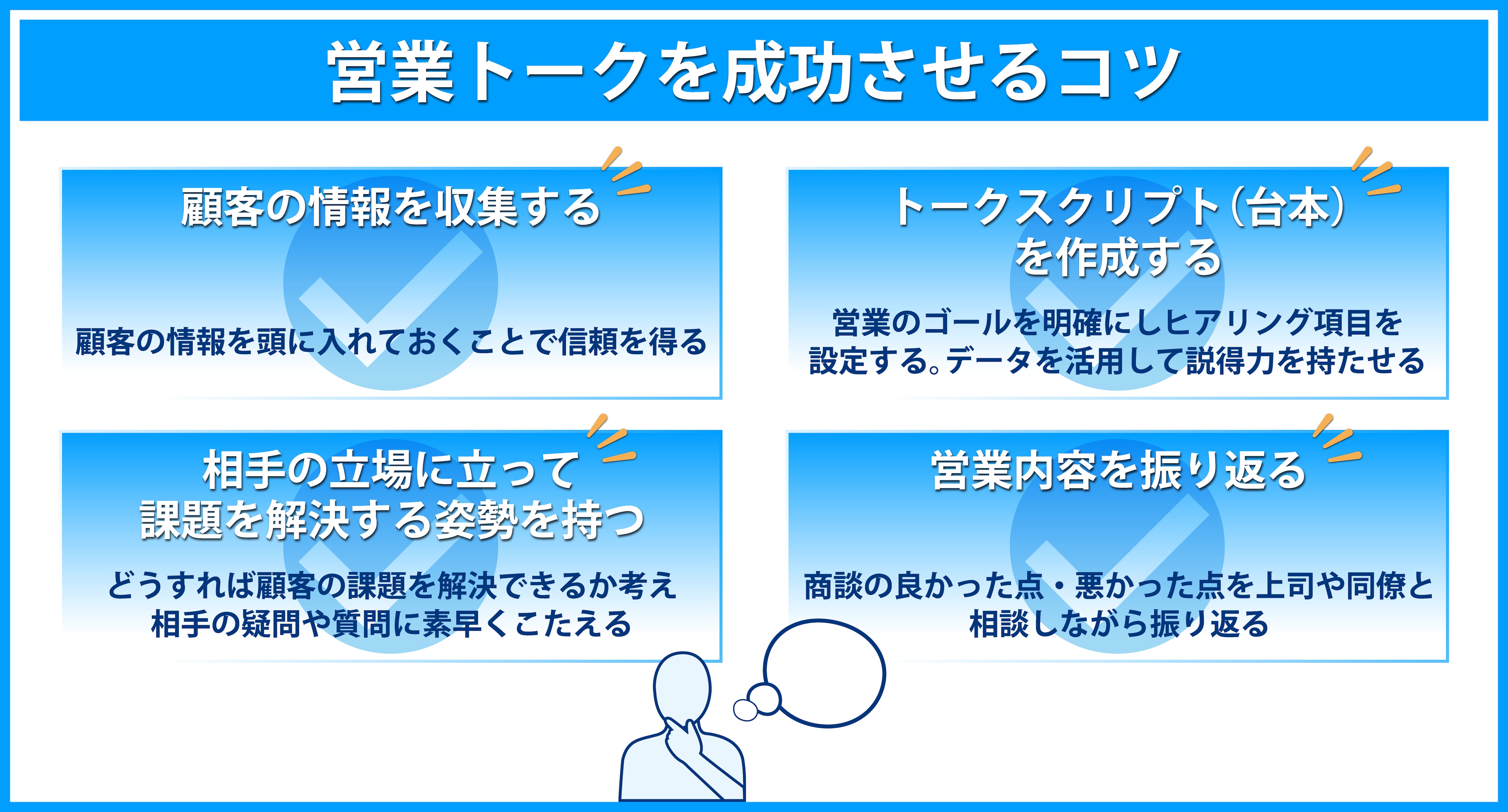 営業トークを成功させるコツを4つ解説します。コツを押さえてトークの内容を工夫していきましょう。