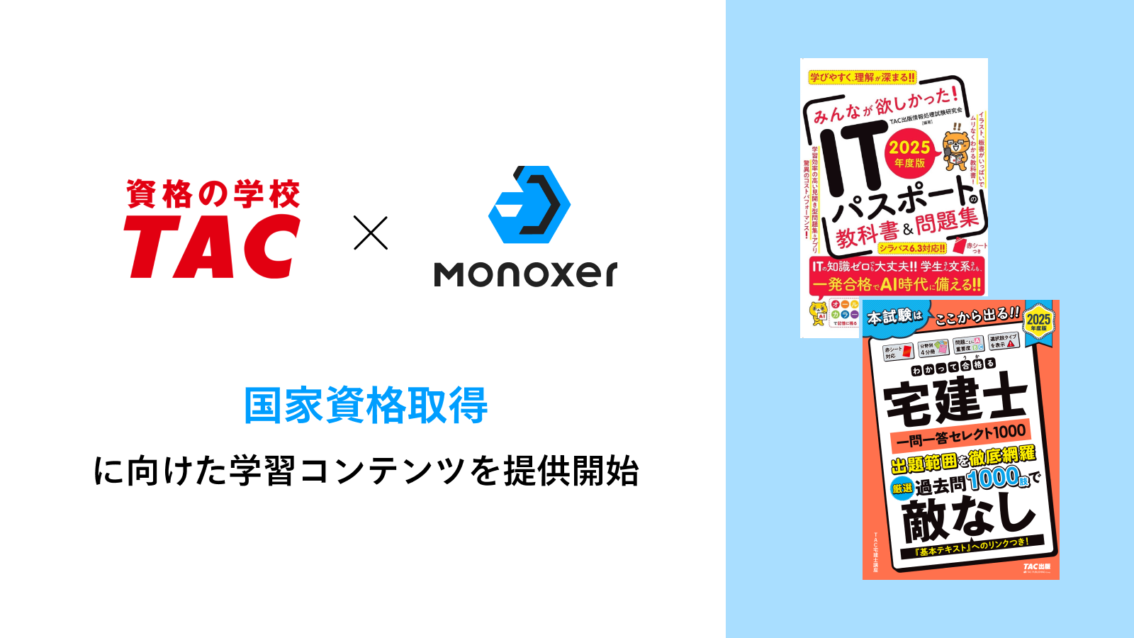 記憶のプラットフォーム「Monoxer(モノグサ)」を提供するモノグサ株式会社(本社:東京都千代田区、代表取締役:竹内 孝太朗、畔柳 圭佑)は、TAC株式会社(東京都千代田区、代表取締役社長:多田 敏男)よりライセンスを受け、年間20万人以上が受験する国家資格「宅地建物取引士」と「ITパスポート」の学習コンテンツを、モノグサマーケットにて販売を開始したことをお知らせいたします。これまでは法人契約をいただいている方のみご利用いただけていましたが、これからは個人利用の方でも購入が可能となります。
