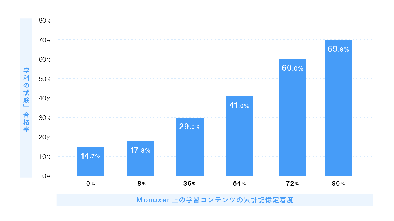 特に、同学院がMonoxer上で提供した学習コンテンツを全90%程度記憶定着できた受講生の合格率は69.8%に上り、これは全国合格率(16.5%)の約4.2倍に相当し、知識の記憶定着度と合格率には強い相関が見られることが分かりました。