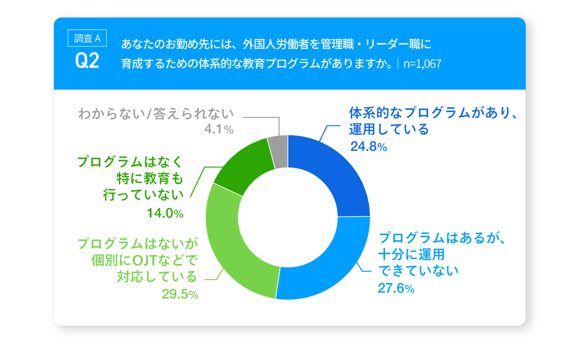 一方で、管理職・リーダー職に育成するための体系的な教育プログラムについて尋ねたところ、「プログラムはあるが、十分に運用できていない」(27.6%)、「プログラムはないが個別にOJTなどで対応している」(29.5%)、「プログラムはなく特に教育も行っていない」(14.0%)の回答を合わせると71.1%に達し、登用意向の高さとは裏腹に、教育体制が追いついていない実態が明らかになりました。