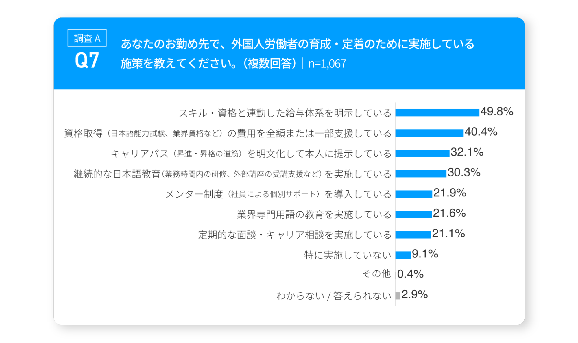 雇用企業が外国人労働者の育成・定着のために実際に実施している施策について尋ねたところ、「スキル・資格と連動した給与体系を明示している」(49.8%)が最多で、「資格取得(日本語能力試験、業界資格など)の費用を全額または一部支援している」(40.4%)、「キャリアパス(昇進・昇格の道筋)を明文化して本人に提示している」(32.1%)が続きました。
