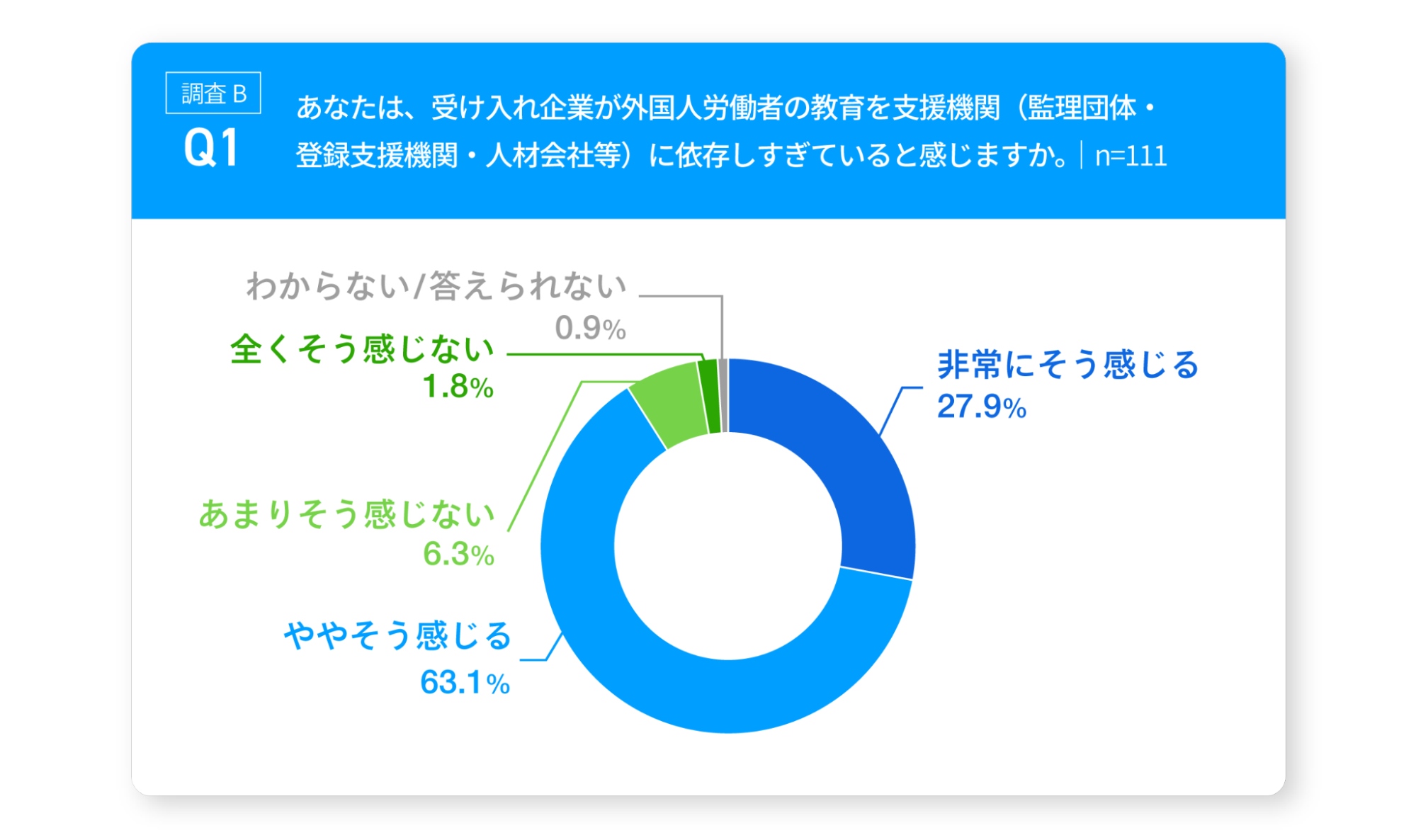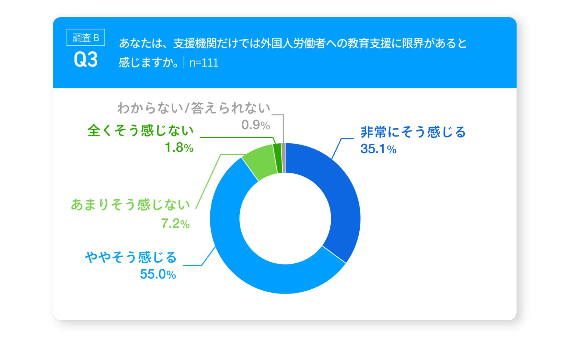 さらに、支援機関だけでは外国人労働者の教育支援に限界があると感じるかという問いに対し、「非常にそう感じる」(35.1%)と「ややそう感じる」(55.0%)を合わせて90.1%が限界を感じていると回答しました。
