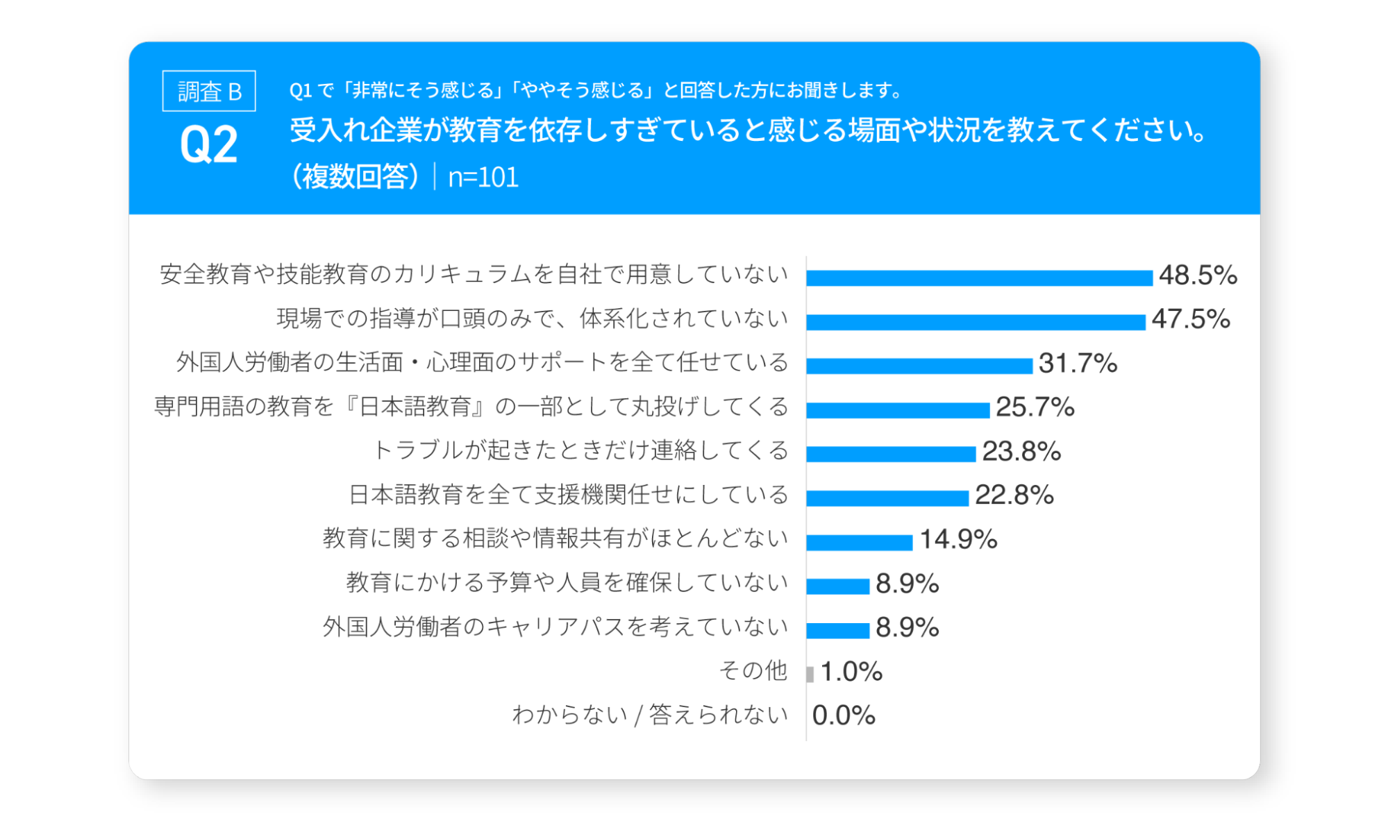 依存傾向を感じると回答した支援機関に対し、具体的にどのような場面や状況で依存を感じるかを尋ねたところ、「安全教育や技能教育のカリキュラムを自社で用意していない」(48.5%)、「現場での指導が口頭のみで、体系化されていない」(47.5%)、「外国人労働者の生活面・心理面のサポートを全て任せている」(31.7%)が上位に挙げられました。