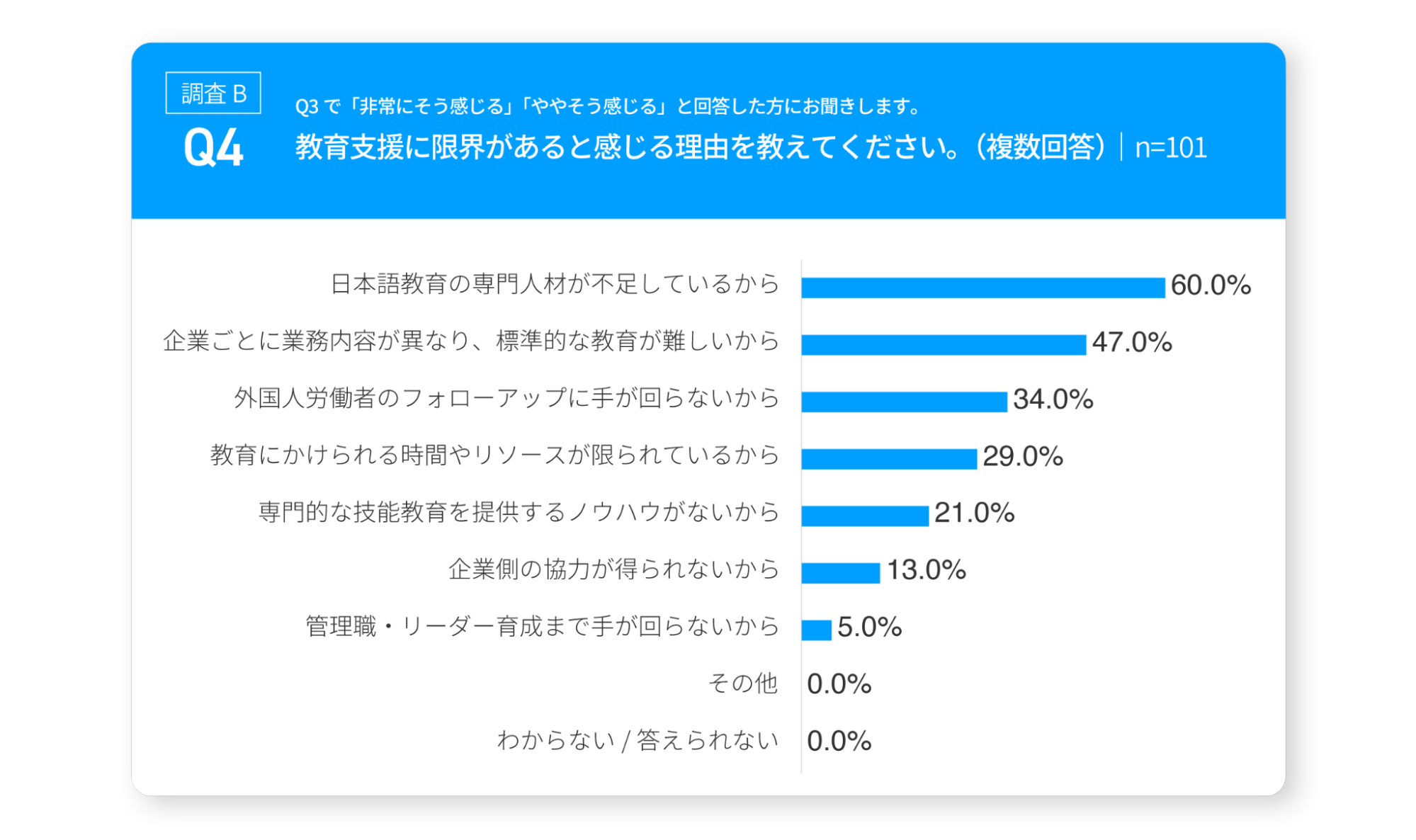 教育支援に限界を感じている支援機関に対し、その具体的な理由を尋ねたところ、「日本語教育の専門人材が不足しているから」(60.0%)が最多で、「企業ごとに業務内容が異なり、標準的な教育が難しいから」(47.0%)、「外国人労働者のフォローアップに手が回らないから」(34.0%)が続きました。